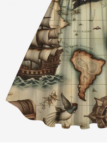 Plus Size Distressed Skull Sailboat Map Steering Wheel Print Hawaii Cruise 1950s Vintage Swing A Line Dress - Black - 3x