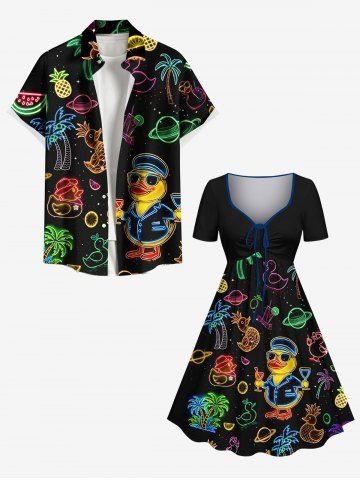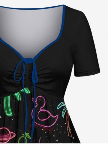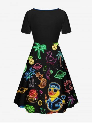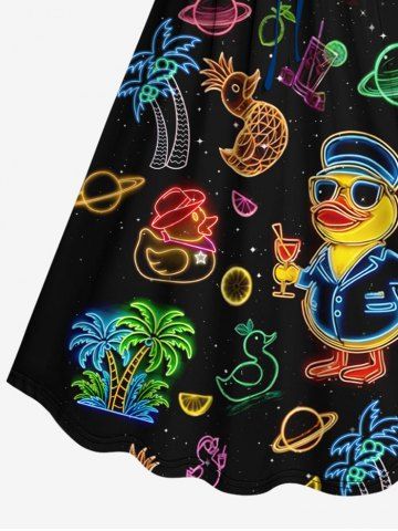 Plus Size Ducks Coconut Tree Watermelon Pineapple Planet Print Cinched Hawaii Dress - Black - 4x
