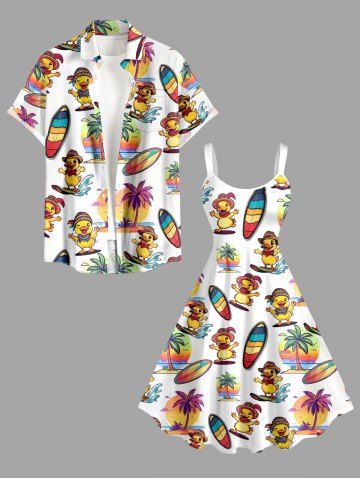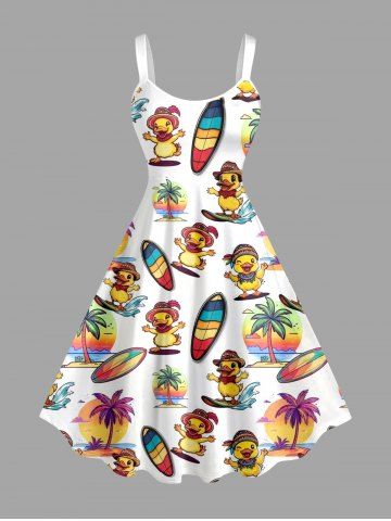 Plus Size Ducks Surfing Board Coconut Tree Print Hawaii Tank Dress - White - M