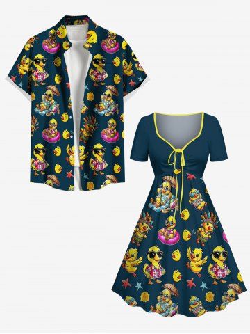 Plus Size Ducks Swimming Ring Starfish Sun Print Cinched Hawaii Dress - Deep Green - 3x