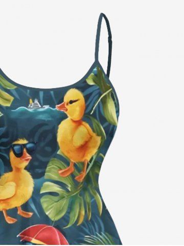 Plus Size Ducks Tropical Leaf Hibiscus Flowers Print High Low Hawaii Cami Dress - Green - Xs