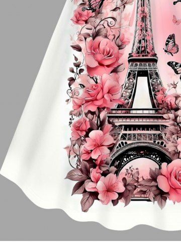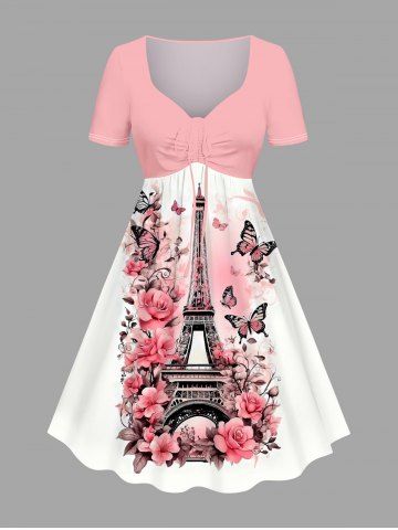 Plus Size Eiffel Tower Butterfly Flowers Print Cinched Hawaii Dress - Light Pink - M