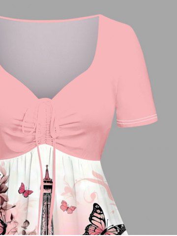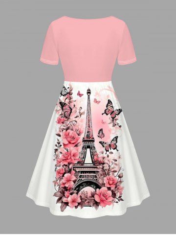 Plus Size Eiffel Tower Butterfly Flowers Print Cinched Hawaii Dress - Light Pink - 6x