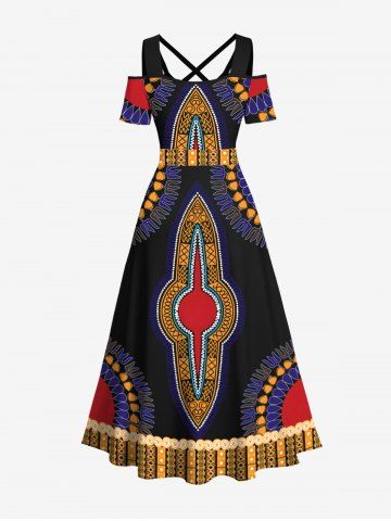 Plus Size Ethnic Geometric Pattern Print Cold Shoulder Crisscross Hawaii Maxi Dress - Black - 4x