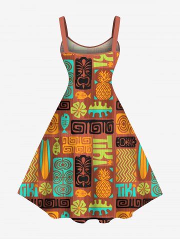 Plus Size Ethnic Graphic Flower Fish Pineapple Print Hawaii A Line Tank Dress - Coffee - 1x
