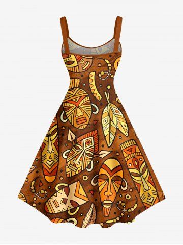 Plus Size Ethnic Graphic Mask Print Hawaii A Line Dress - Brown - Xxs