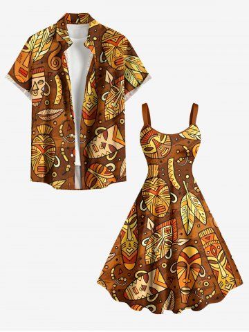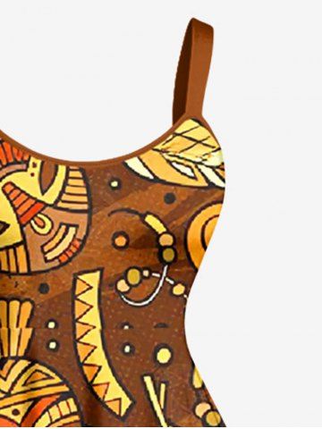 Plus Size Ethnic Graphic Mask Print Hawaii A Line Dress - Brown - 1x