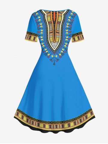 Plus Size Ethnic Pattern Print Hawaii Vintage Dress - Blue - 3x