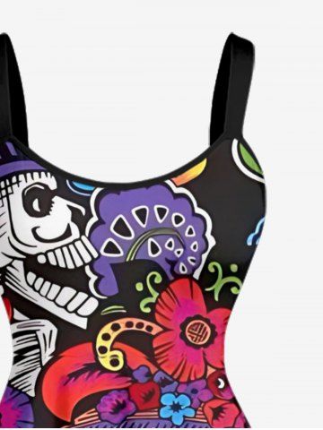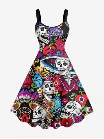 Plus Size Ethnic Skulls Flower Print Hawaii A Line Dress - Black - Xs