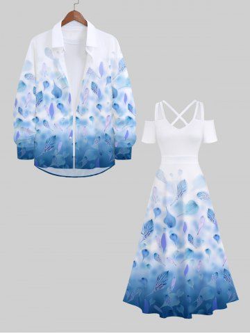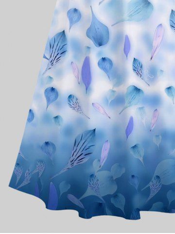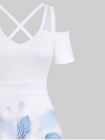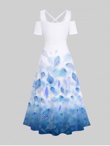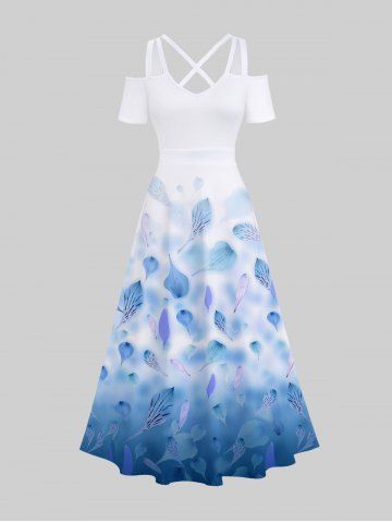 Plus Size Feather Leaf Ombre Colorblock Print Cold Shoulder Crisscross Hawaii Maxi Dress - White - 3x