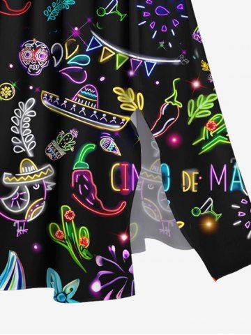 Plus Size Fish Plant Straw Hat Vegetable Floral Skull Print Split Hawaii Midi Dress - Black - M