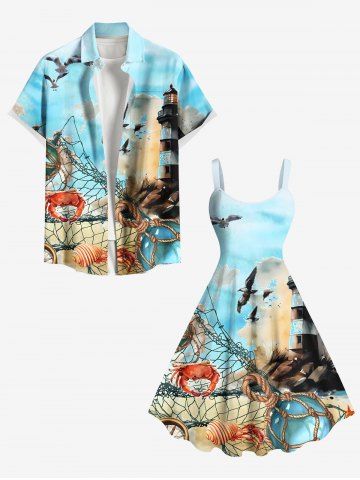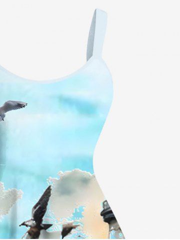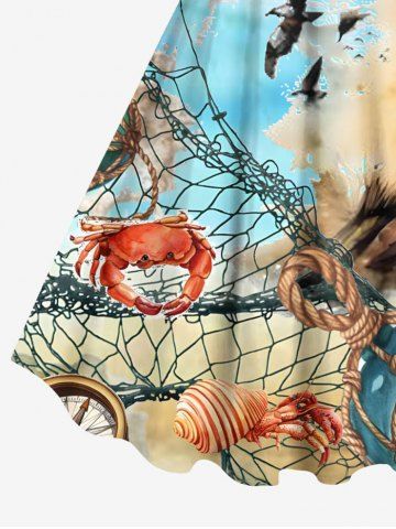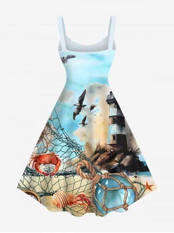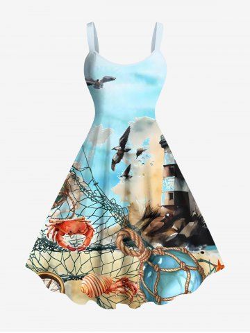 Plus Size Fishing Nets Crabs Conch Shells Lighthouse Bird Ombre Sky Print Hawaii Cruise A Line Tank Dress - Light Blue - 1x