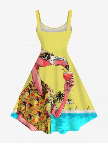 Plus Size Flamingo Coconut Tree Fruit Juice Seascape Print Hawaii Tank Dress - Yellow - 6x