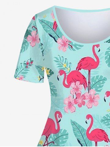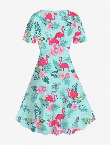 Plus Size Flamingo Coconut Tree Leaf Floral Print Vintage Hawaii A Line Dress - Light Green - Xs