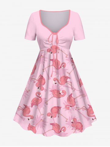 Plus Size Flamingo Coconut Tree Print Cinched Hawaii Dress - Light Pink - M