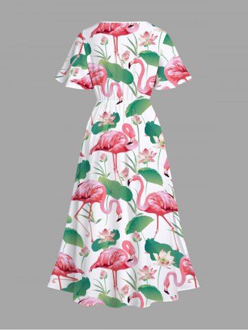 Plus Size Flamingo Lotus Flower Leaf Print Hawaii Split Pocket A Line Midi Dress - White - 2x