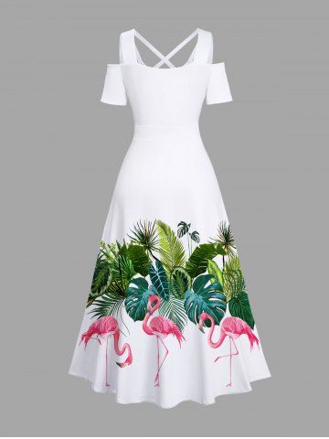 Plus Size Flamingo Tropical Leaf Print Hawaii Cold Shoulder Crisscross A Line Maxi Dress - White - 3x