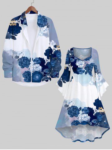 Graphic Dresses > Plus Size Flare Sleeves Watercolor Ombre Flower Print Halloween Costume Ruched High Low Asymmetric Dress