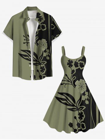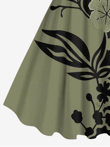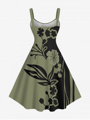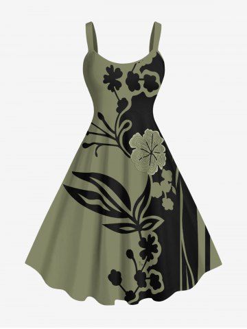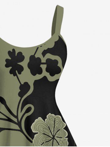 Plus Size Flower Branch Leaf Two Tone Print Hawaii A Line Tank Dress - Deep Green - 6x