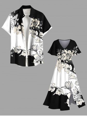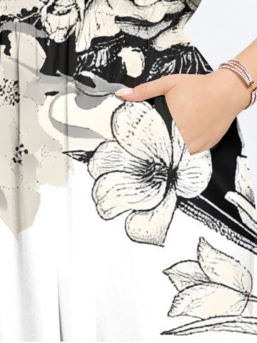 Plus Size Flower Branch Print Hawaii Split Pocket A Line Midi Dress - Black - S