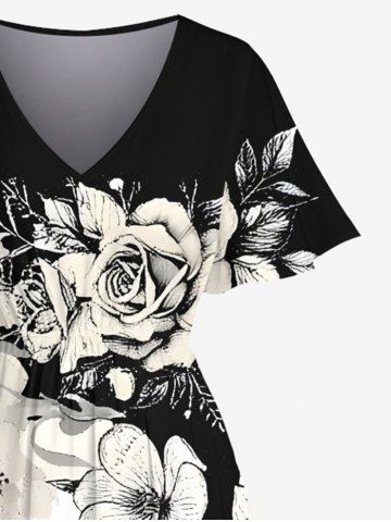 Plus Size Flower Branch Print Hawaii Split Pocket A Line Midi Dress - Black - 2x