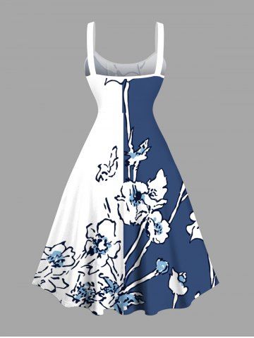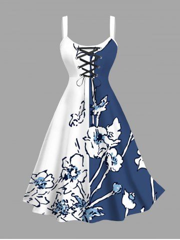 Graphic Dresses > Plus Size Floral Butterfly Colorblock Print Hawaii Lace Up A Line Tank Dress