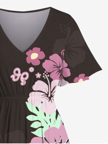 Plus Size Floral Butterfly Leaves Print Hawaii Split Pocket A Line Midi Dress - Deep Coffee - S