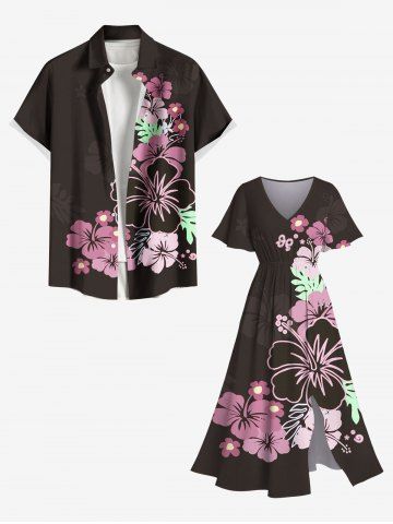 Plus Size Floral Butterfly Leaves Print Hawaii Split Pocket A Line Midi Dress - Deep Coffee - 1x