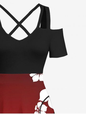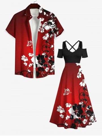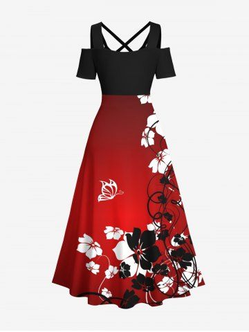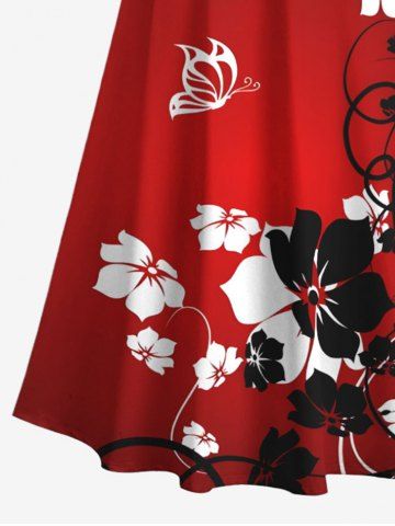 Plus Size Floral Curve Butterfly Print Hawaii Crisscross Ombre A Line Maxi Dress - Red - 5x