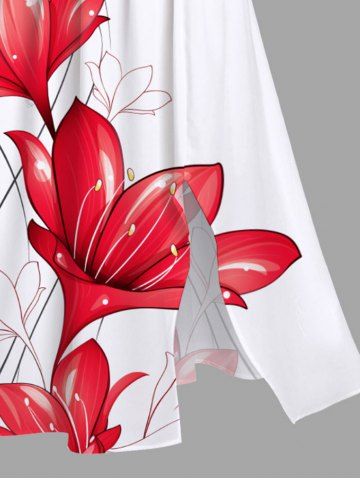 Plus Size Floral Curve Two Tone Print Hawaii Split Pocket A Line Midi Dress - White - S