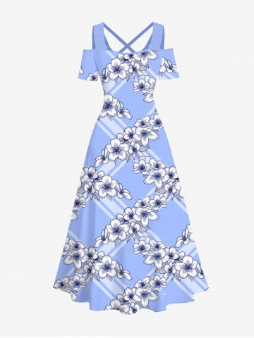 Plus Size Floral Geometric Plaid Print Hawaii Crisscross A Line Maxi Dress - Light Blue - S