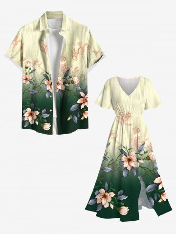 Graphic Dresses > Plus Size Floral Leaf Branch Ombre Print Hawaii Split Pocket A Line Midi Dress