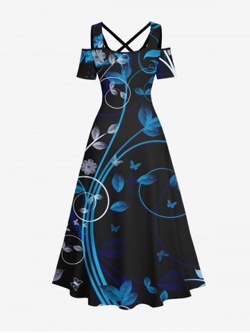 Graphic Dresses > Plus Size Floral Leaf Butterfly Curve Print Hawaii Crisscross A Line Maxi Dress