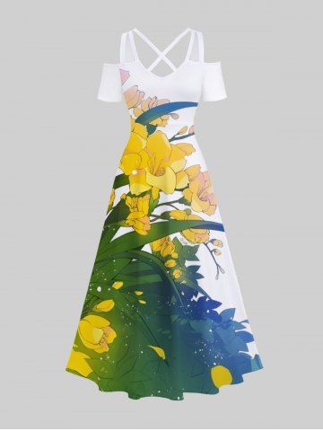 Plus Size Floral Leaf Print Hawaii Crisscross A Line Maxi Dress - White - 3x