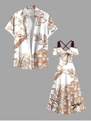 Graphic Dresses > Plus Size Floral Leaves Branch Bowknot Print Hawaii Cold Shoulder Crisscross A Line Maxi Dress