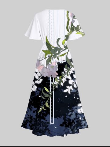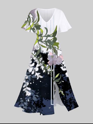 Graphic Dresses > Plus Size Flower Leaf Branch Colorblock Print Hawaii Split Pocket A Line Midi Dress