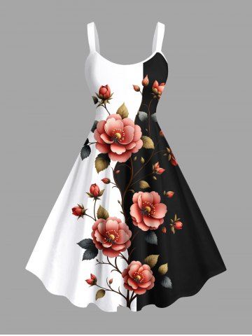 Graphic Dresses > Plus Size Flower Leaf Branch Contrast Colorblock Print Hawaii A Line Tank Dress