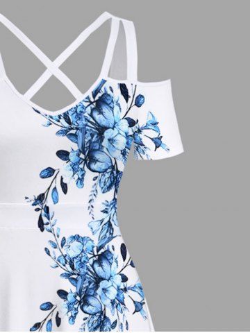 Plus Size Floral Leaves Branch Print Hawaii Cold Shoulder Crisscross A Line Maxi Dress - White - L