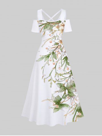 Plus Size Floral Leaves Branch Print Hawaii Crisscross A Line Maxi Dress - White - 4x