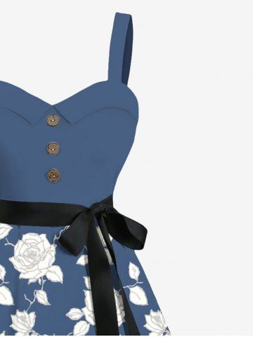 Plus Size Floral Leaves Branch Two Tone Print Hawaii Button A Line Tank Dress with Removable Belt - Blue - S