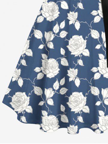 Plus Size Floral Leaves Branch Two Tone Print Hawaii Button A Line Tank Dress with Removable Belt - Blue - 5x