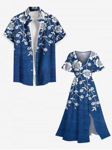 Plus Size Floral Leaves Branch Two Tone Print Hawaii Split Pocket A Line Midi Dress - Blue - Xxs