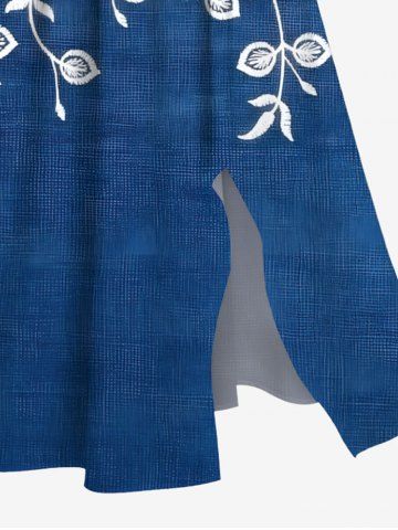 Plus Size Floral Leaves Branch Two Tone Print Hawaii Split Pocket A Line Midi Dress - Blue - Xs