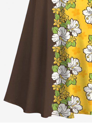 Plus Size Floral Leaves Contrast Colorblock Print Hawaii Cold Shoulder Crisscross A Line Maxi Dress - Yellow - 6x