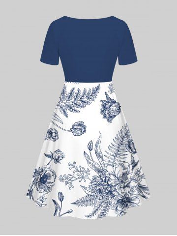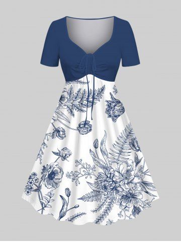 Graphic Dresses > Plus Size Floral Leaves Print Hawaii Cinched A Line Dress