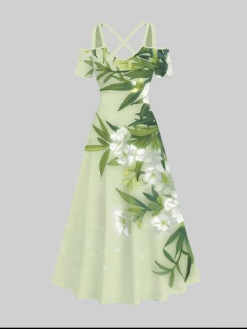 Plus Size Flower Leaf Print Hawaii Crisscross A Line Maxi Dress - Light Green - M
