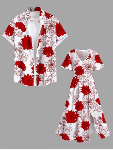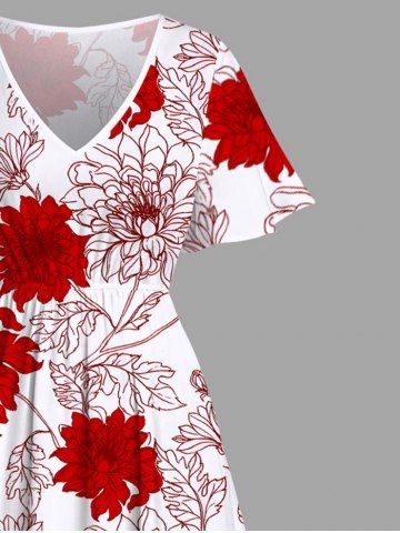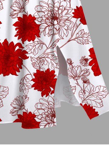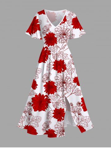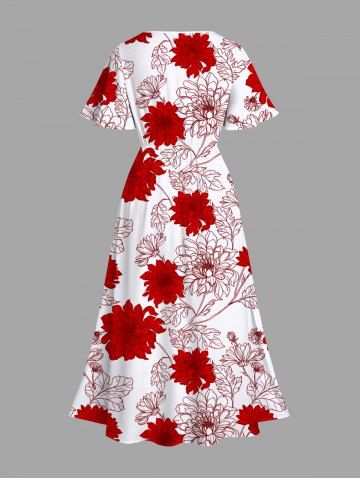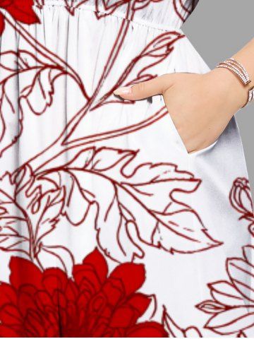 Plus Size Floral Leaves Print Hawaii Split Pocket A Line Midi Dress - Red - M