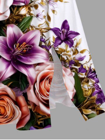 Plus Size Flower Leaf Print Hawaii Split Pocket A Line Midi Dress - Purple - L