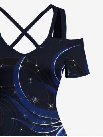 Plus Size Floral Pattern Glitter 3D Print Cold Shoulder Crisscross Hawaii Maxi Dress - Blue - S