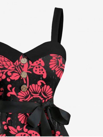 Plus Size Floral Pine Cones Print Hawaii Button A Line Tank Dress with Removable Belt - Red - 3x